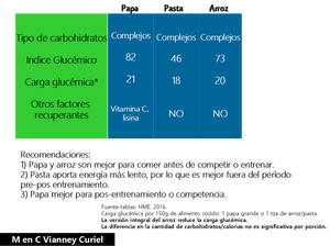 Es de conocimiento general para los atletas que los carbohidratos son fundamentales para su rendimiento deportivo. En la alimentación hay muchas Fuentes de tales nutrimentos: frutas, azúcares, leguminosas y los cereales. Éstos últmos son ricos carbohidratos complejos que favorecen la recuperación y brindan energía para soportar el entrenamiento o competencia. Dentro de los principales cereales de la dieta del mundo se ecuentran la pasta, el arroz y las papas.