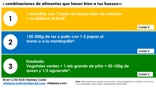 Además del calcio (que deja de almacenarse a los 20-25 años) los huesos requieren de un buen consumo de proteínas en la dieta, así como lisina (un aminoácido) y vitamina C. En la dieta la combinaciones de alimentos importan bien porque nos aportan distintos nutrimentos o para aprovechar mejor lo que comemos. Así que checa la imagen y combina tus alimentos.