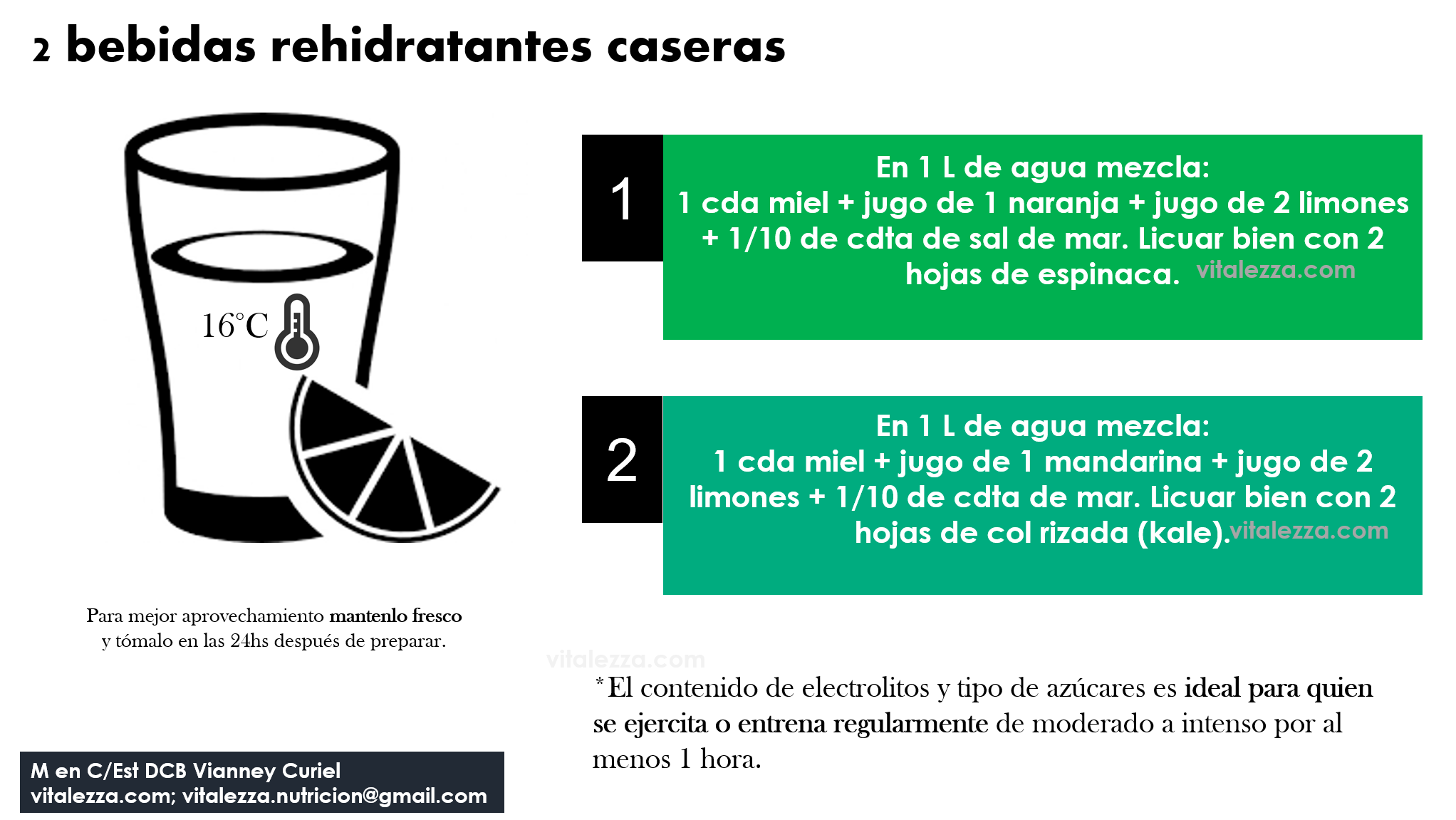 Aquí te sugerimos 2 ejemplos de bebidas caseras que, comparadas con muchos bebidas deportivas, jugos y refrescos, tienen la gran ventaja de no contener aditivos, tener un pH más alto y tener suficientes electrolitos y energía, lo que contribuye a una mejor hidratación y rendimiento.