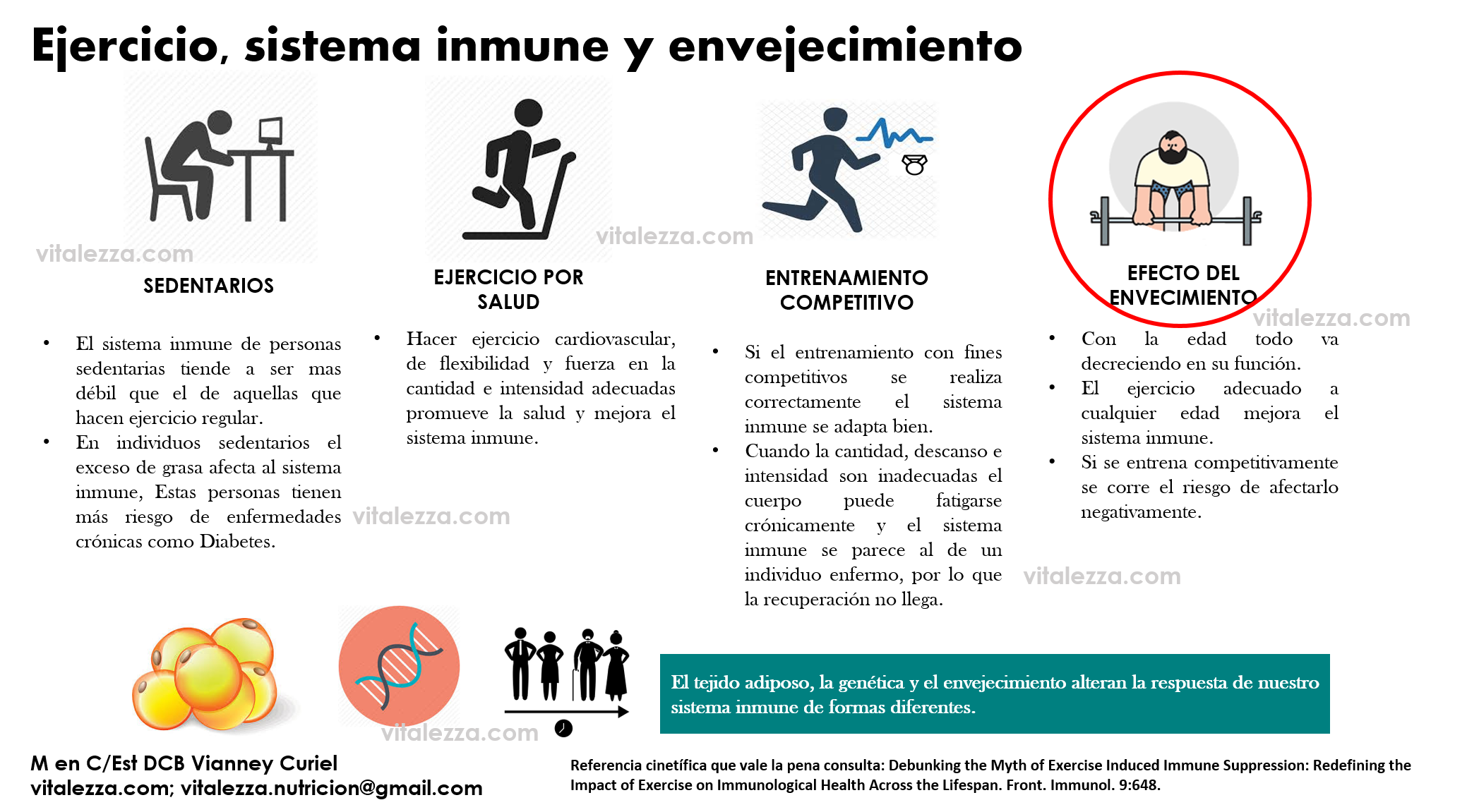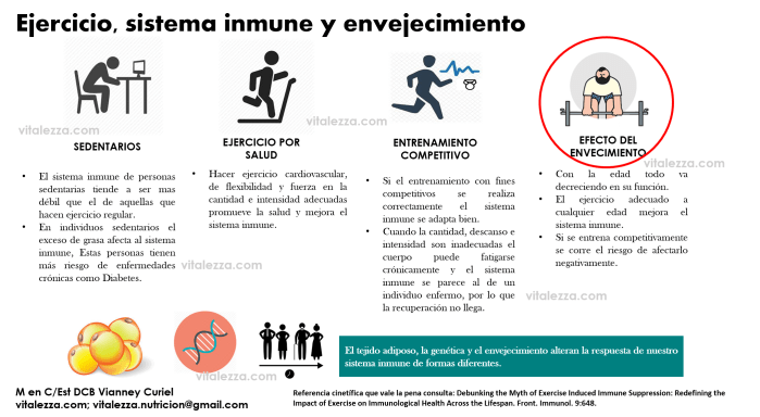 Checa la siguiente imagen donde destacamos algunos puntos importantes de la relación del sistema inmune con el ejercicio y el envejecimiento.