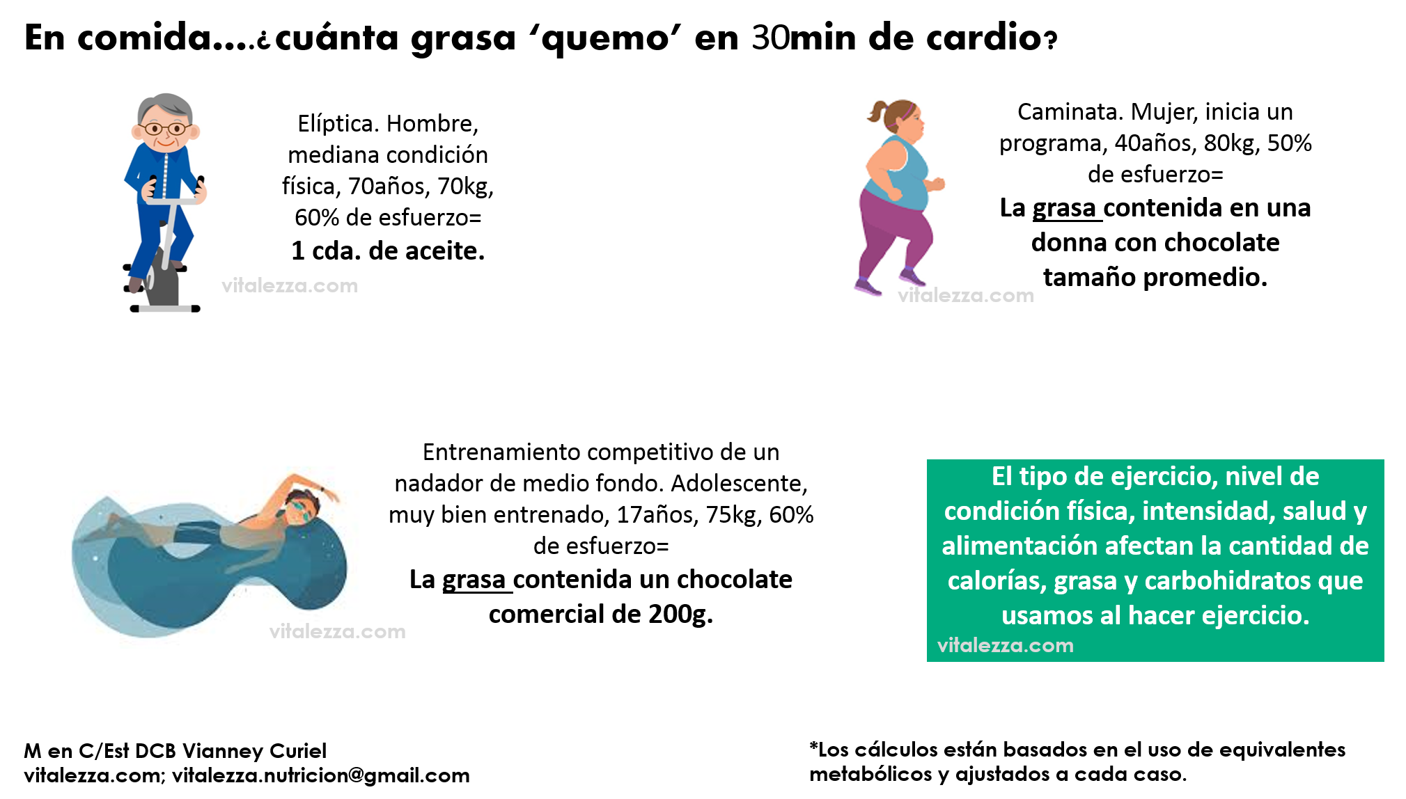 Checa la siguiente imagen donde ponemos algunos casos considerando una intensidad de ejercicio que favorece un poco más el uso de grasa y los traducimos en alimentos.