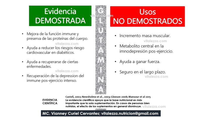 La glutamina se expende en forma de suplemento como L-glutamina pretendiendo ayudar de distintas formas con el rendimiento físico. No obstante, no todas las funciones para las cuáles quien la recomienda dicen que funciona. Te invitamos a checar la siguiente imagen que sintetiza algunos aspectos para los cuáles si hay evidencia en investigación que apoya este uso.
