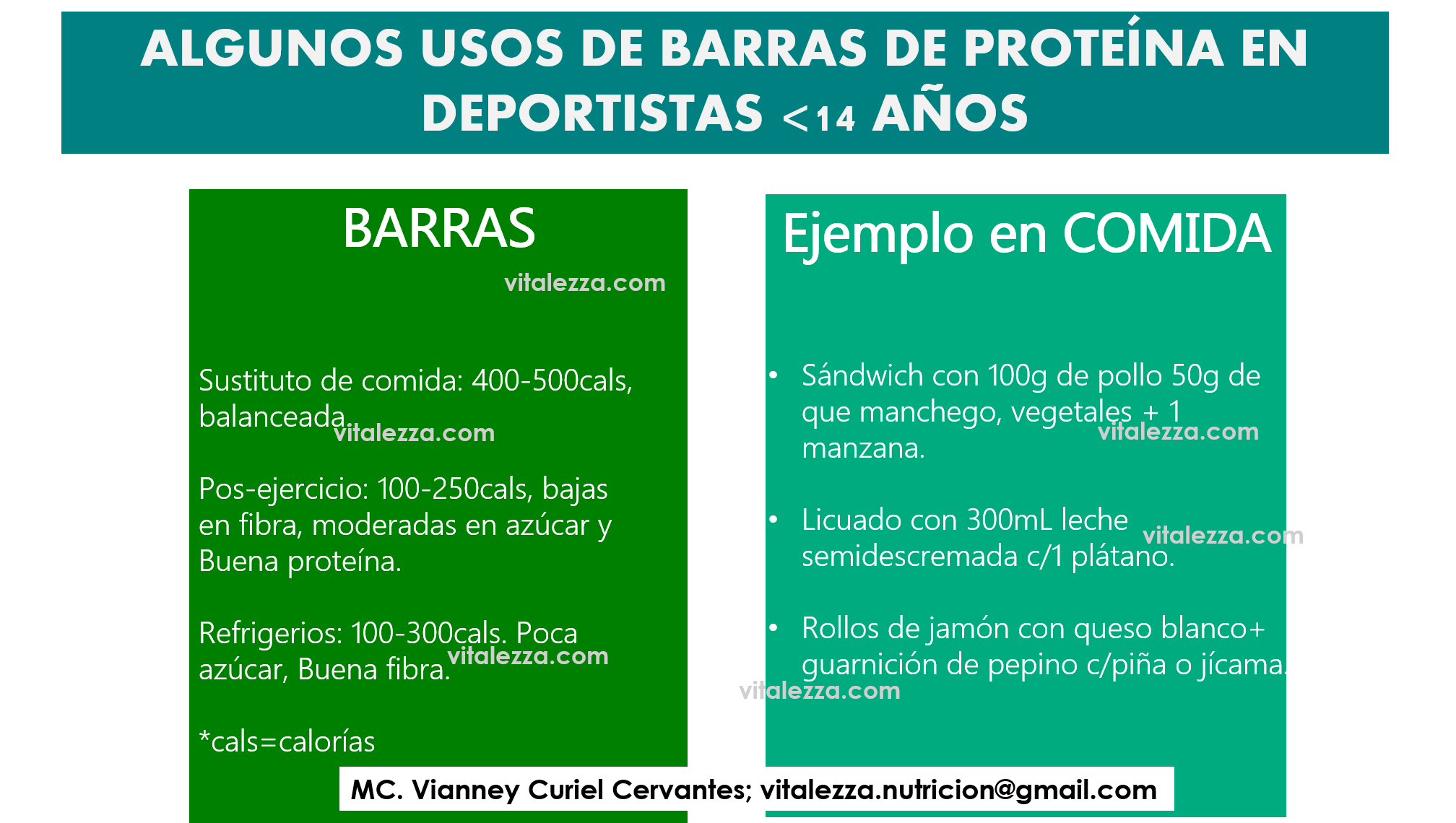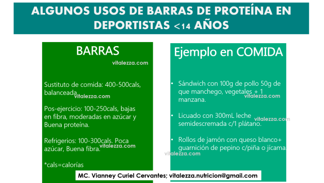 Como la mayoría de las veces el contenido energético o calorías de las barras deportivas tiene la misma distribución de proteínas, grasas y/o carbohidratos, para hacer más práctico podemos hacer las siguientes sugerencias del uso de barras de proteína en deportistas menores de 14 años.