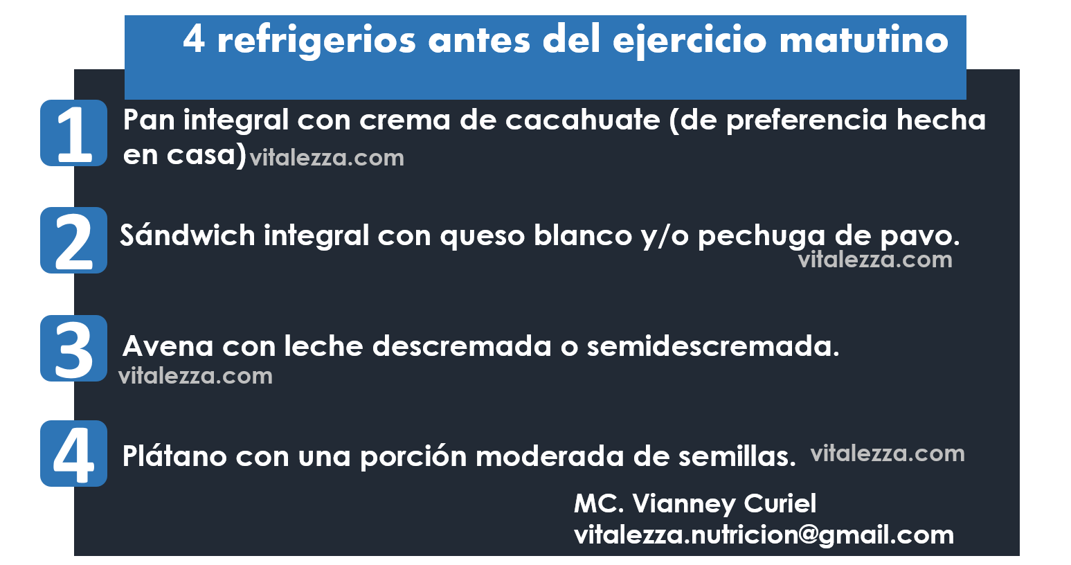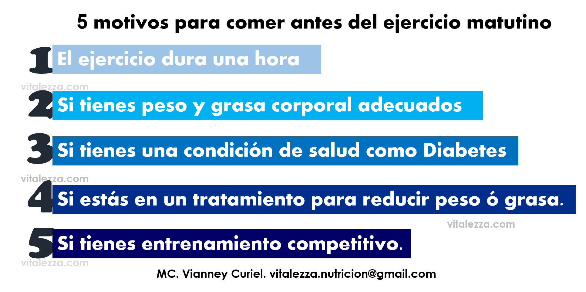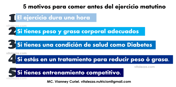 ¿Qué comer antes de hacer ejercicio? La mejor respuesta a esa pregunta es: depende de las necesidades individuales, es decir de factores como tipo de entrenamiento, nivel de entrenamiento, gasto de energía en el ejercicio (cantidad de calorías) y nutrimentos (carbohidratos, ácidos grasos), objetivo competitivo, cantidad de músculo y grasa, estado de salud de la persona, horario, etc.
