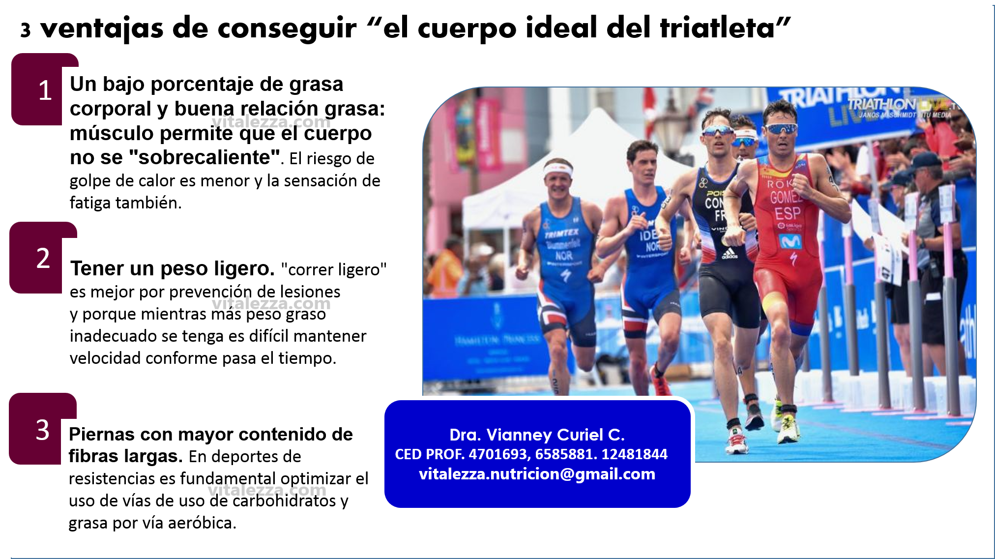 Bien dicen que una imagen dice más que mil palabras y arriba se muestran las características físicas del un cuerpo de un triatleta de elite internacional: de estatura media a alto (1.70 a 1.90m), delgado y de bajo peso para la estatura, con bajo porcentaje de grasa (idealmente menor a 10%) y desarrollo muscular de ligero a moderado.