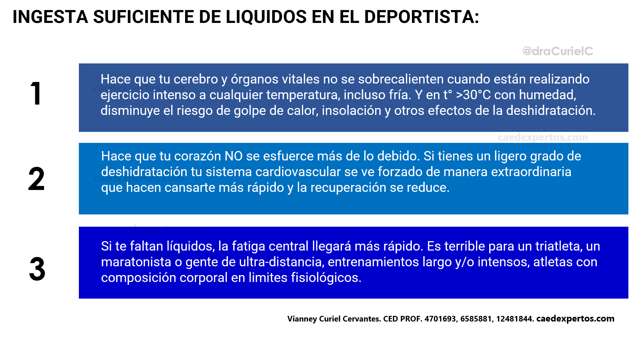 Especialmente en el rendimiento deportivo el agua y la ingesta suficiente de líquidos rehidratantes tienen diversas funciones. A continuación enlistaré las principales de una manera un tanto más práctica que conceptual: